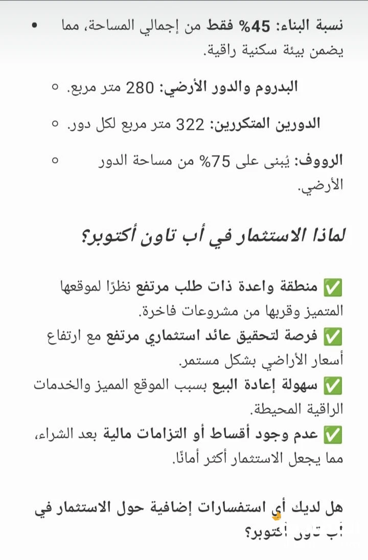 أرض ڤيلات 622م إسكان فاخر بثمن شقة (فقط 3 مليون و732 ألف) في آب تاون أكتوبر (الرقابة الإدارية) ،خالصة الاقساط، الحي مرفق بالكامل باعلى جودة مرافق وشبكات بنية تحتية من الجيل الرابع، نسبه المبانى ٤٥٪ بدروم واراضي ودورين متكرر ورؤف بنسبة 75%، مساحات خضراء ١٤٠٠ فدان، تنظيم راقي جدا للمجاورات والميادين والشوارع ، الأراضي، اراضي موثقة بإخطار ومحضر استلام، كراسة شروط من هيئة المجتمعات العمرانية الجديدة، ومحاطة بأكبر محاور خدمية وترفيهيه ومباني فندقية وكمبوندات فاخرة وقريبة من كل المحاور والطرق الرئيسية، على بعد دقيقتين لمحطة مونوريل اكتوبر الجديدة، ٤ دقائق الي طريق الواحات، ٩ دقائق لجامعة كمبوند بادية وبالم هيلز، ١٤ دقيقة لمول مصر ولوصلة دهشور (الشيخ زايد)، و١٥ دقيقة لمطار سفنكس الدولي.