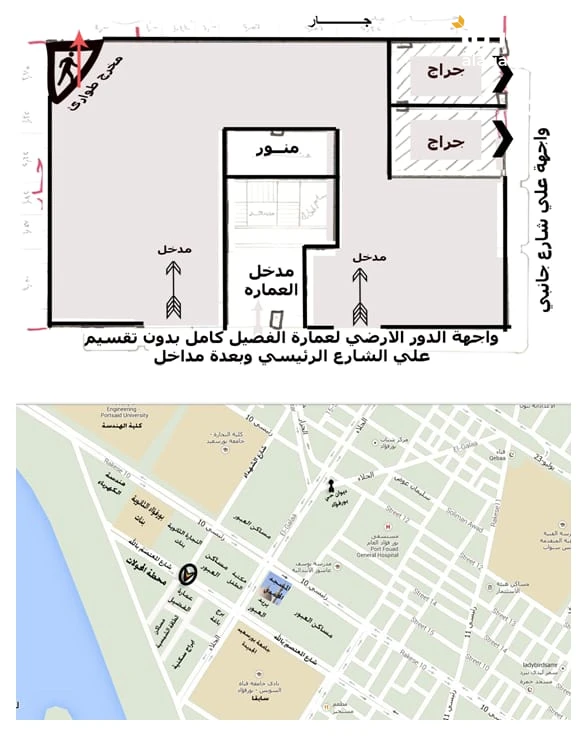 للبيع محل كبير بكامل مساحة الدور الأرضي علي شارعين بواجهة ٢٠ متر علي شارع رئيسي وبمدخلبن مزود بالكهرباء ٣ فاز ومياه وغاز بعمارة الفضيل ببورفؤاد