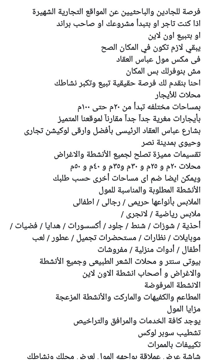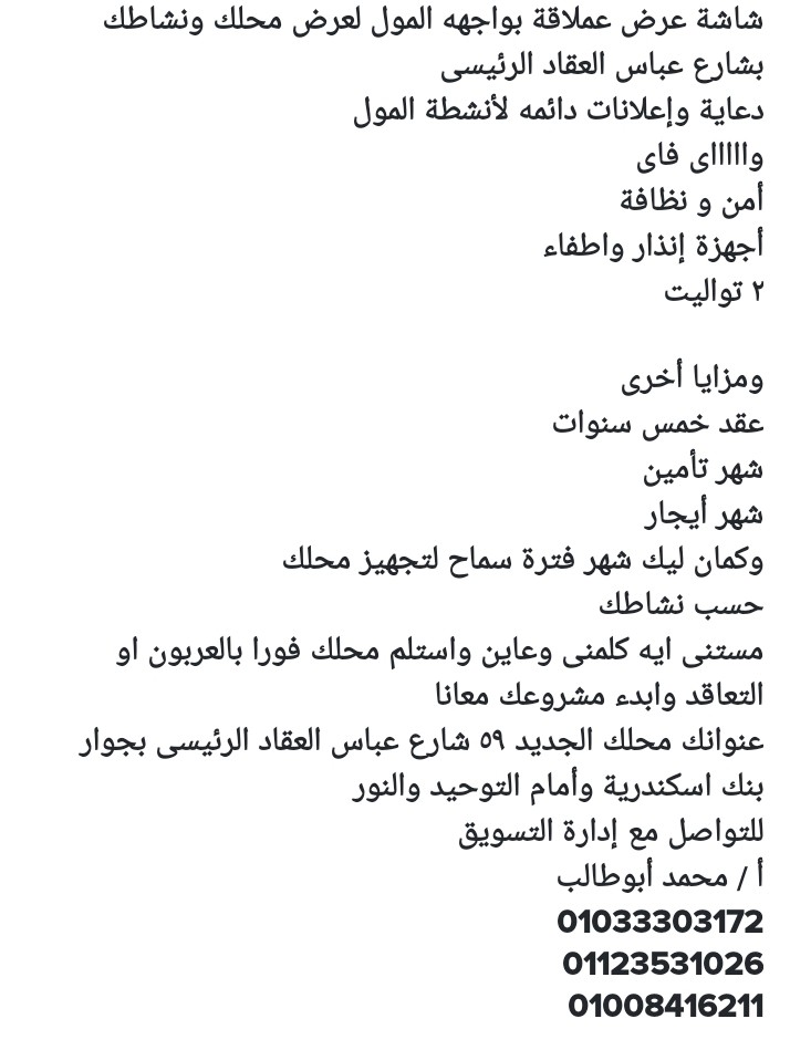 فرصة للجادين محلات للأيجار بمول تجارى بشارع عباس العقاد الرئيسى بموقع حيوى وتجارى وسط أقوى المحلات والبرندات التجارية بمساحات مختلفه تبدأ تبدأ من ٢٠م حتى ١٠٠م بأيجارات مغرية جدآ تشطيب سوبر لوكس واجهات عريضة تصلح لمحلات الملابس بأنواعها والأحذية والشوزات والجلود والأكسسورات ومستحضرات التجميل والموبايل ولعب الأطفال والفضيات والعطور والطرح والمفروشات والأدوات المنزلية و لأنشطة الأون لاين ولجميع الأنشطة ماعدا المطاعم والكفيهات والماركت عقد خمس سنوات شهر تأمين وشهر أيجار مزايا المول يوجد شاشة عرض للمول على عباس العقاد الرئيسى لأنشطة المول خدمات إعلانية لأنشطة المول جميع الخدمات والمرافق تشطيب سوبر لوكس بوفيه ٢ تواليت للأتصال 01033303172 01123531026